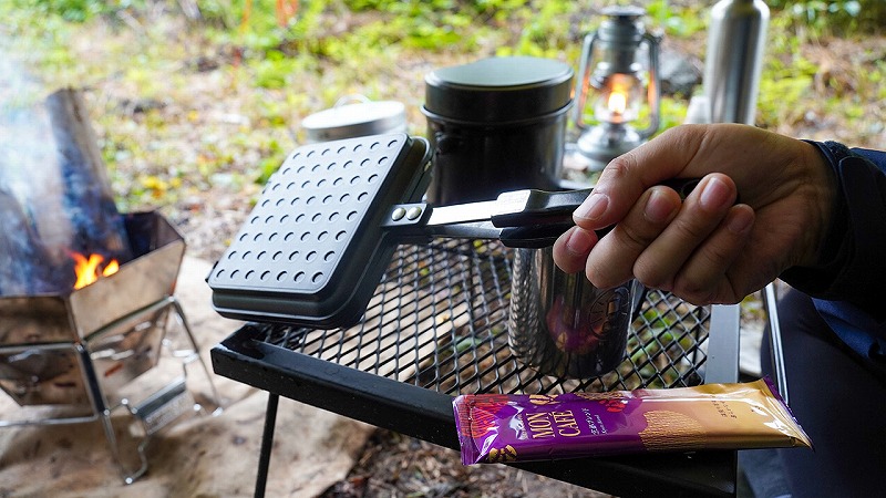 焚き火にのせて肉を焼きました。ソロ用でちょうどいい大きさです。